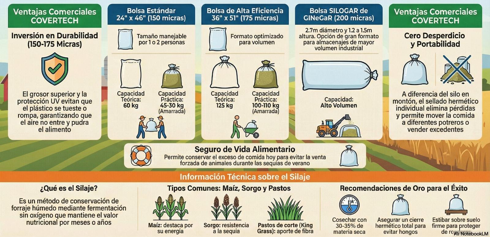 Describimos las soluciones de almacenamiento agrícola, enfocados en la técnica del ensilaje para conservar forraje nutritivo. Se detallan las especificaciones técnicas de diversas bolsas plásticas, las cuales varían en dimensiones y grosor de micras para soportar diferentes capacidades de carga. Estos productos actúan como un seguro alimentario para el ganado, permitiendo a los productores guardar alimento de alta calidad durante las épocas de sequía. La información resalta la importancia de la fermentación anaeróbica y un sellado hermético para evitar la formación de hongos o el desperdicio de materia prima. Finalmente, se ofrecen recomendaciones logísticas sobre la protección UV del material y el manejo adecuado para prevenir daños por plagas o factores climáticos.